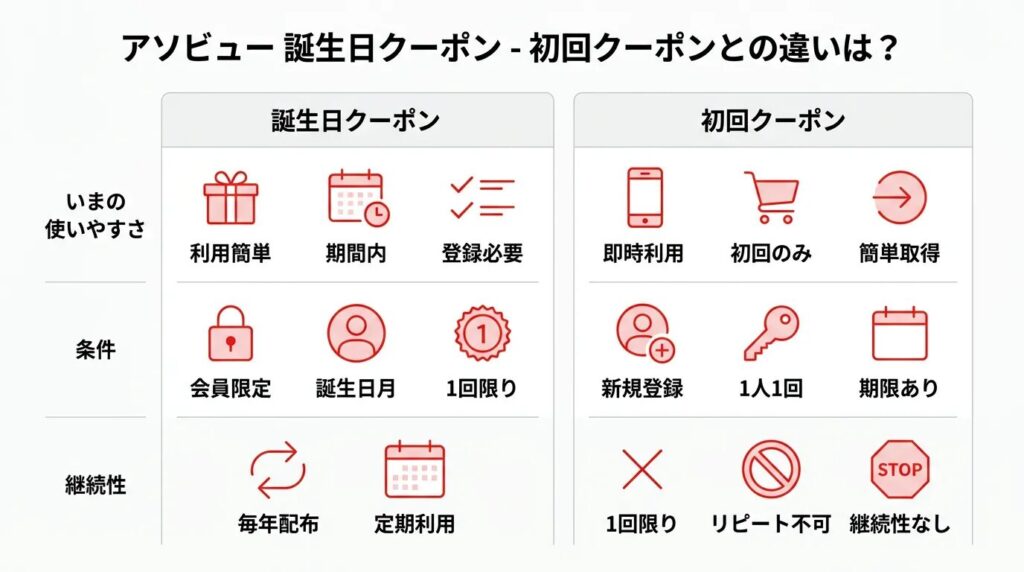 ここは比較で知りたい人が多いところです。前のセクションまでで誕生日クーポンの条件が見えたので、初回クーポンと並べると違いがはっきりします。