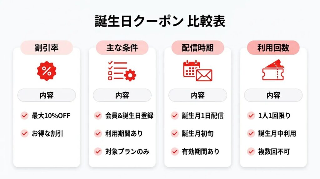 | 比較項目 | 誕生日クーポン | 初回クーポン |