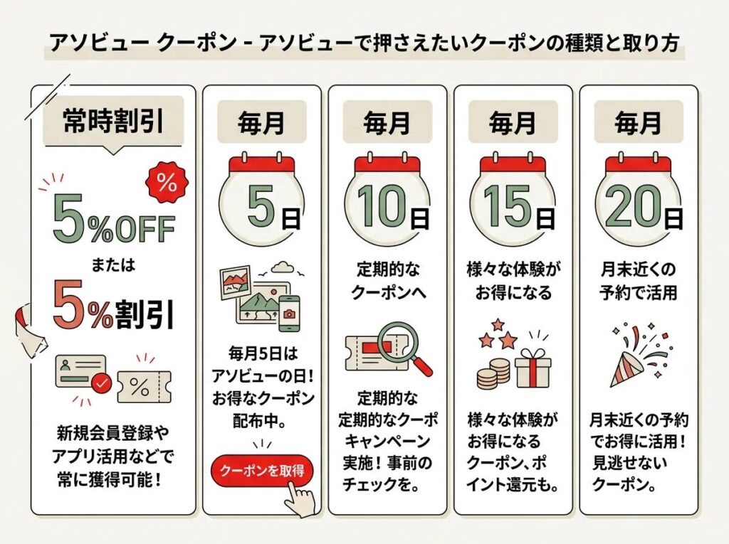 この記事では、アソビューで今使えるクーポンの全体像を先に見せたうえで、「自分はどれを使えばいいのか」まで判断しやすい形でまとめます。