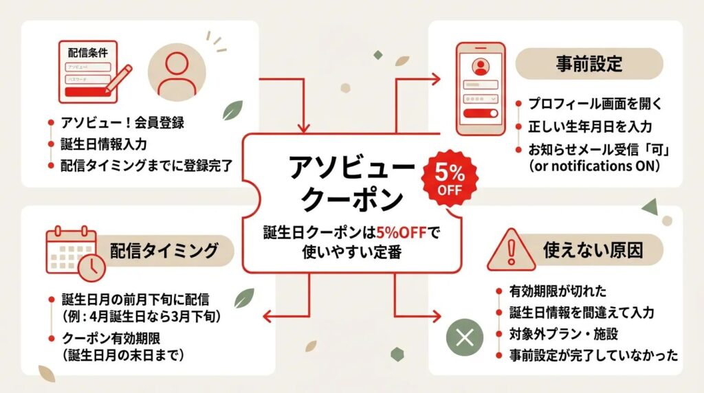 アソビューの誕生日クーポンは、メルマガ会員向けに配信される5%OFF特典です。生年月日登録とメルマガ受信設定が前提ですが、条件を満たしていれば使いやすい割引です。