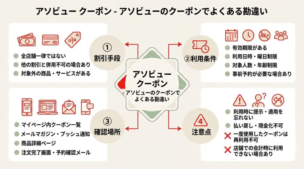 コードが合っているつもりでも、スペース混入や 0O の誤入力、施設公式HP経由での流入などで弾かれることがあります。詳しい切り分けはアソビューのクーポンが使えない時の記事でまとめています。