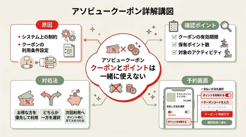 アソビューでは、クーポン同士の併用はできません。ポイントとも同時利用できないので、「一番条件がいい1つを選ぶ」と考えるのが基本です。