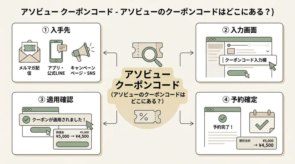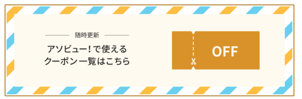 各クーポンの取得条件はアソビューのクーポン完全ガイドで詳しく整理しています。