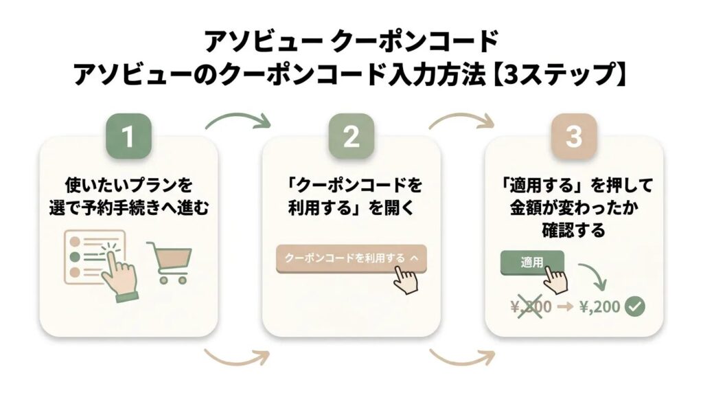 今使える割引の全体像はアソビューのクーポン完全ガイドで整理しています。