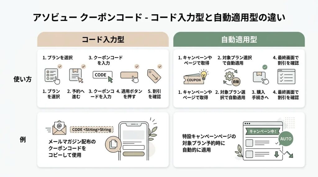 アソビューのクーポンは「コード入力型」と「自動適用型」がある