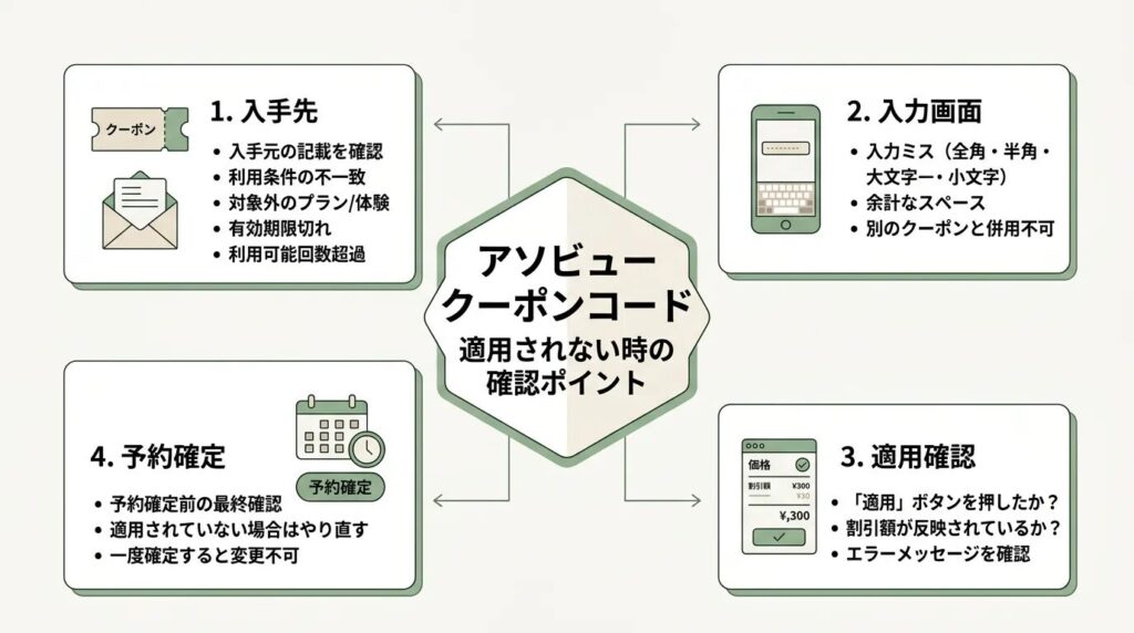 より広く「使えない原因」を見たい場合は、アソビューのクーポンが使えない時の記事で整理しています。