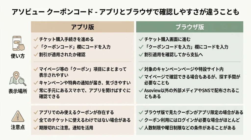 アソビューでは、情報によってはブラウザのほうが追いやすい場面があります。特にクーポン一覧や条件確認は、ブラウザのほうが見やすいと感じる人も多いはずです。