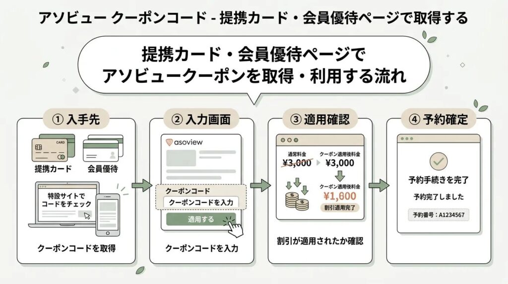 | クーポンコードはどこにある? | 公式会員登録ページ、提携カードの会員ページ、メルマガ、LINE特典など |