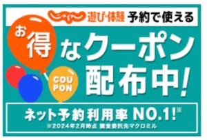 - 1予約1クーポン: 遊び体験クーポンは1予約につき1枚のみ。クーポン同士の併用はできません