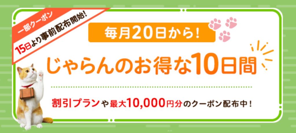 | 4,お得な10日間 | 最大3,000円 | 毎月20日〜29日頃 | 不可(1予約1枚) |
