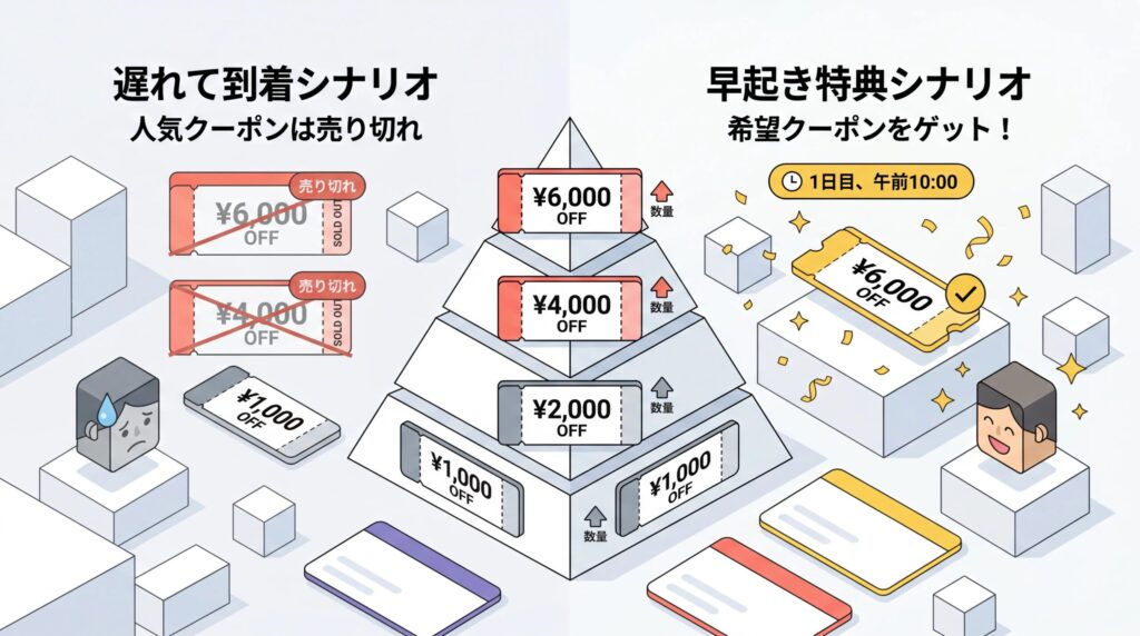 高額クーポンほど配布枚数が少なく、開催初日の早い時間帯に売り切れる傾向があります。