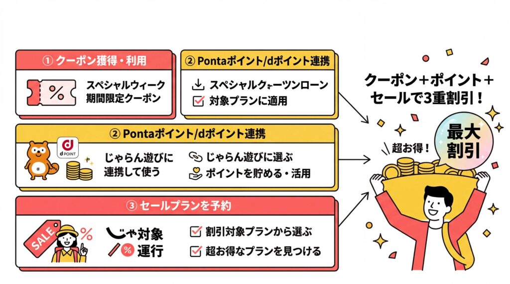 - クーポン+ポイント+セールプランの3重割引で割引を最大化