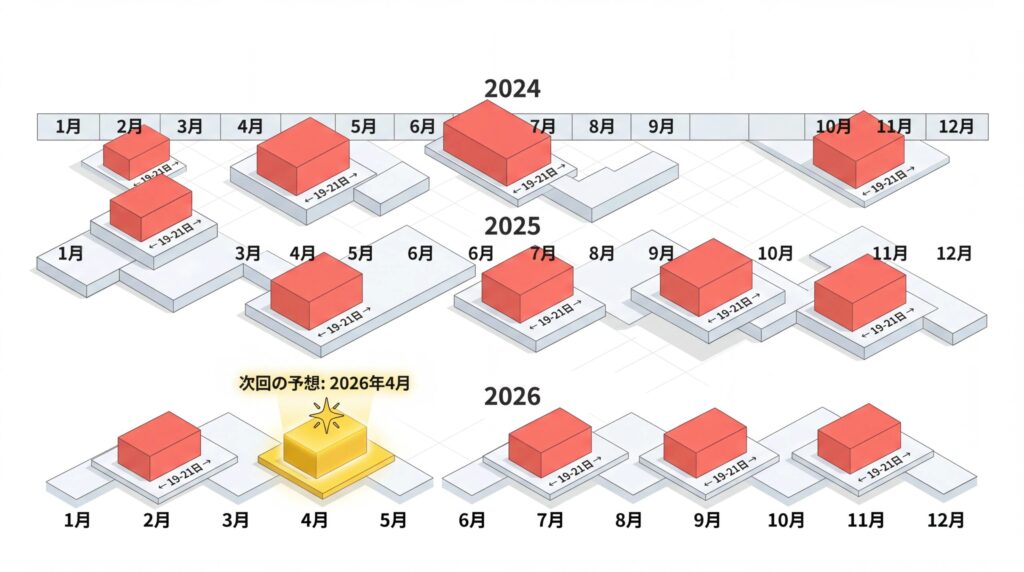 過去の実績を見ると、開催月は2月・4月・7月・9月・11月あたりに集中しており、2〜3ヶ月間隔で回ってきます。開催期間は19〜21日間です。