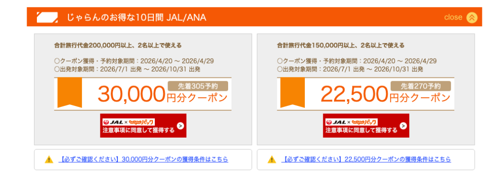 じゃらん クーポンのキャンペーン枠(お得な10日間・スペシャルウィーク・ふるさとお得)