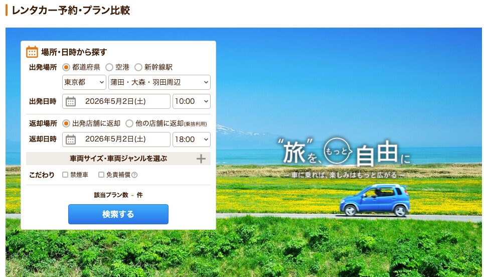数百円〜数千円の定額型が中心。配布期間が短いキャンペーン枠と、特定エリア(沖縄・北海道など)限定枠の2タイプで運用されています。宿泊予約と同時に取れていれば、空港送迎・乗り捨て手数料の負担を軽減できます。