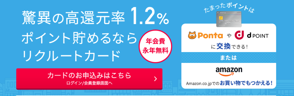 リクルートカード決済で全予約に1.2%還元。じゃらん予約はもちろん他のリクルート系サービスでも使え、年会費永年無料のため決済を寄せる価値が高いカードです。じゃらんポイントとして自動加算されます。