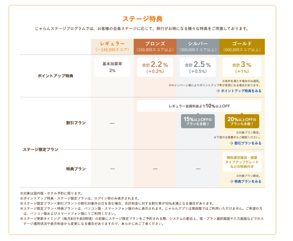 じゃらんを年に数回使うなら、会員ランクも見ておきたいところです。ステージプログラム(レギュラー/ブロンズ/シルバー/ゴールド)でポイント還元率が2.0〜3.0%に変動し、ランク別の専用クーポン枠が配布されることもあります。