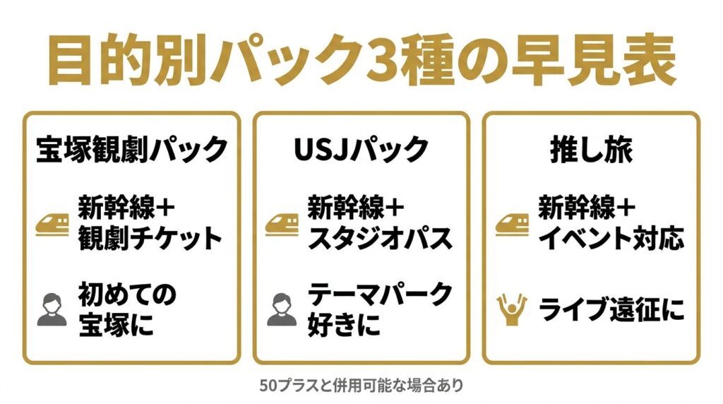 宝塚ファンやUSJ好きなら、チケットと新幹線を別々に手配するより確実に手間が省けます。人気公演は新幹線パックの方がチケットが取りやすいケースもあるとか