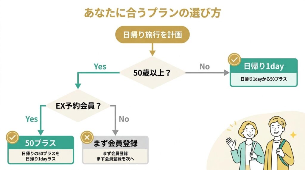 50歳以上のエクスプレス予約会員なら50プラスの方が割安になるケースが多いです。50歳未満の方やスマートEX会員の方は日帰り1dayを選んでください