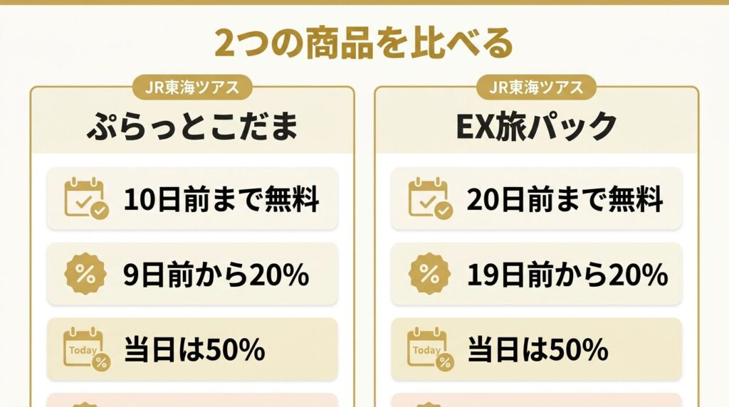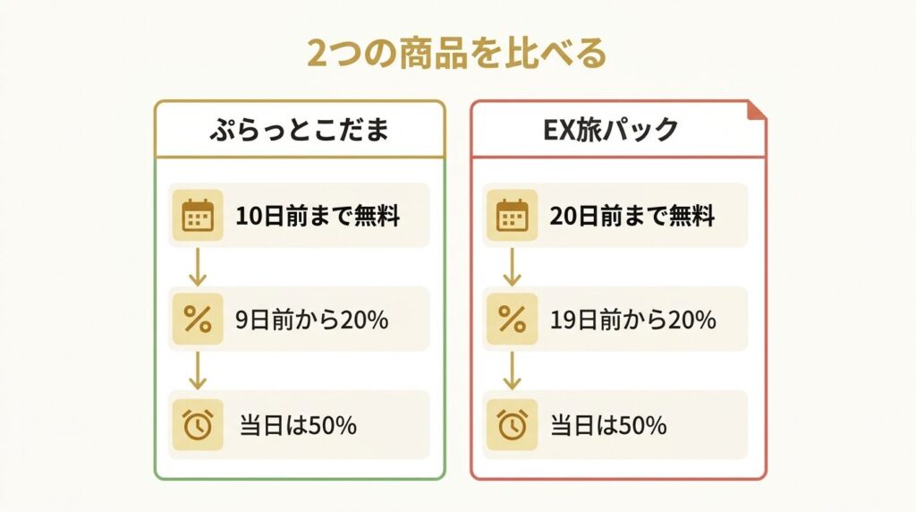 ぷらっとこだまは11日前まで無料、EX旅パックは21日前まで無料。予定変更の可能性があるなら、この「無料キャンセル期限」を意識しておくと安心です。
