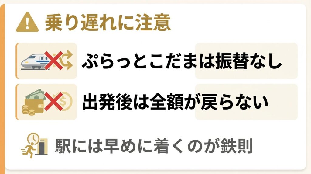 ただしJR側の原因(列車の遅延・運休)で乗り遅れた場合は救済措置があります。自己責任の乗り遅れは無効になるので、駅には余裕を持って到着しましょう。