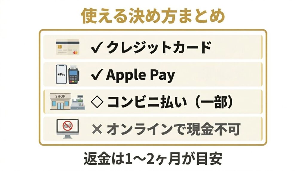 キャンセル時の返金は、決済に使用したクレジットカードへの返金処理となります。返金タイミングはカード会社の締め日により異なりますが、通常1〜2ヶ月程度。