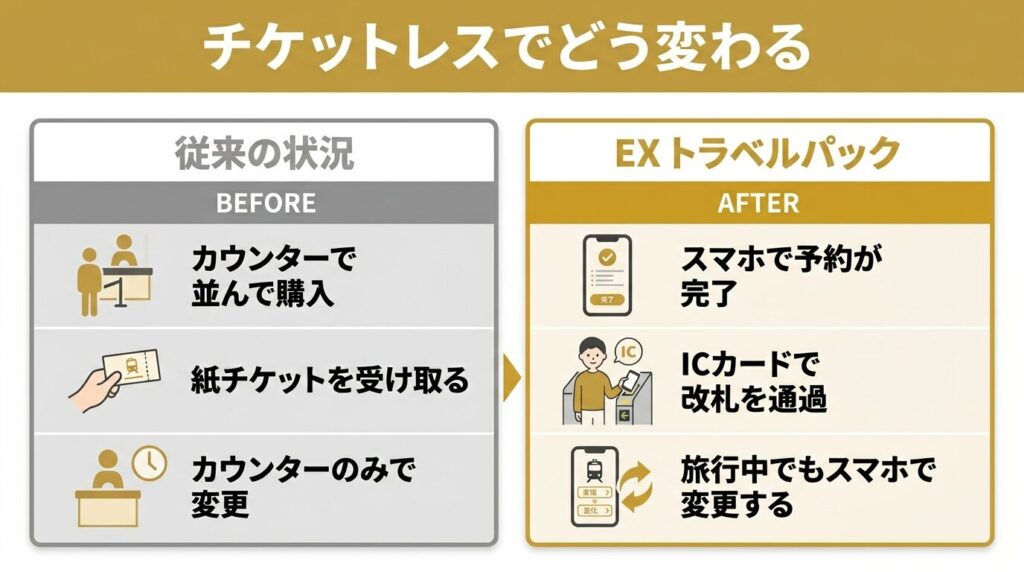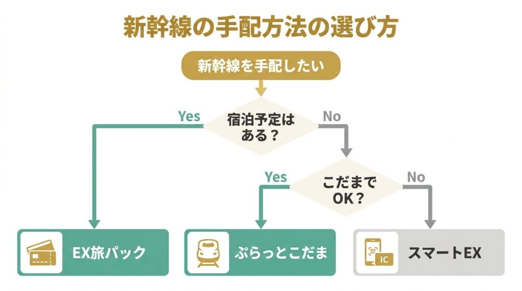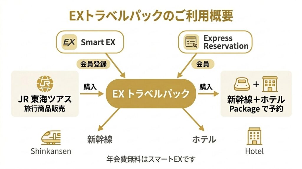 「きっぷだけ買いたい」→スマートEX。「ホテルもまとめて安く手配したい」→EX旅パック。この使い分けを覚えておけば迷いません