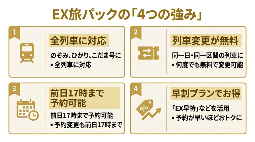 列車変更が当日中なら何度でも無料というのは、ぷらっとこだま(変更不可)にはないEX旅パック最大の強みです。