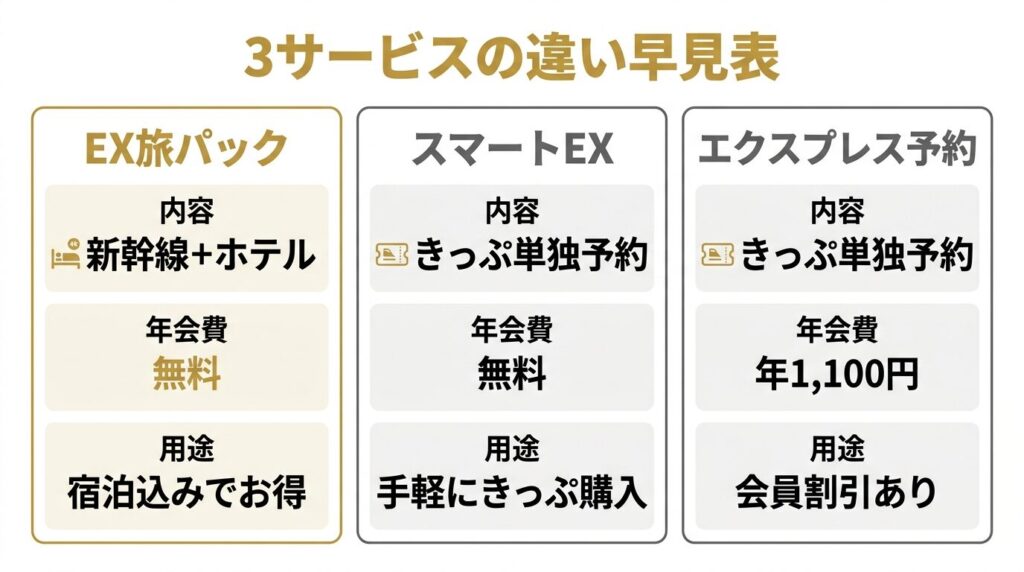EX旅パック・スマートEX・エクスプレス予約は名前が似ていて混同しやすいですが、役割が異なります。