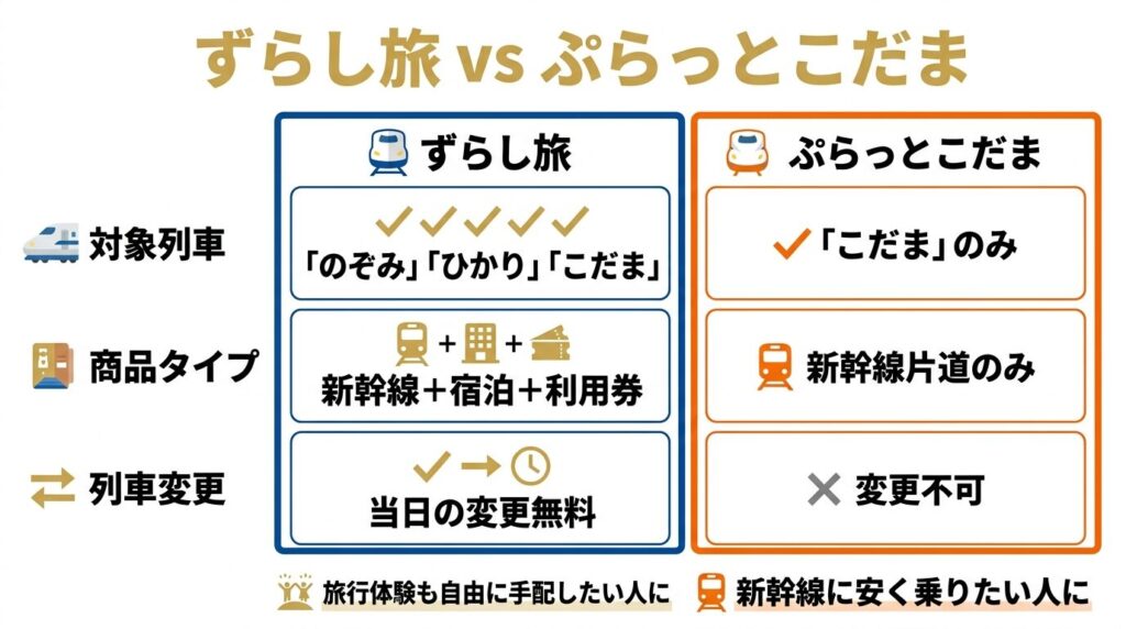 | 比較項目 | ずらし旅 | ぷらっとこだま |