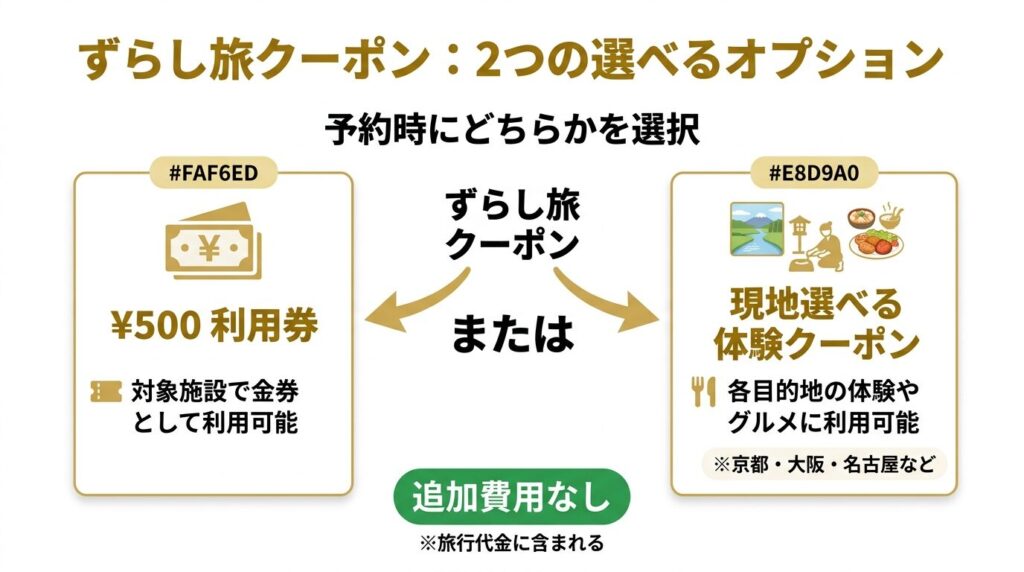 以前は「選べる体験」クーポン(アクティビティや飲食に使える電子クーポン)が提供されていましたが、2026年4月出発分からは500円(税込)分利用券またはご当地セレクトクーポンに変更されています。