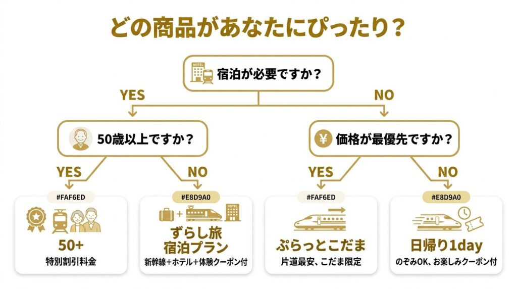 こだま限定で安さを優先するならぷらっとこだま、列車の自由度と旅先体験を重視するならずらし旅という使い分けがおすすめです。
