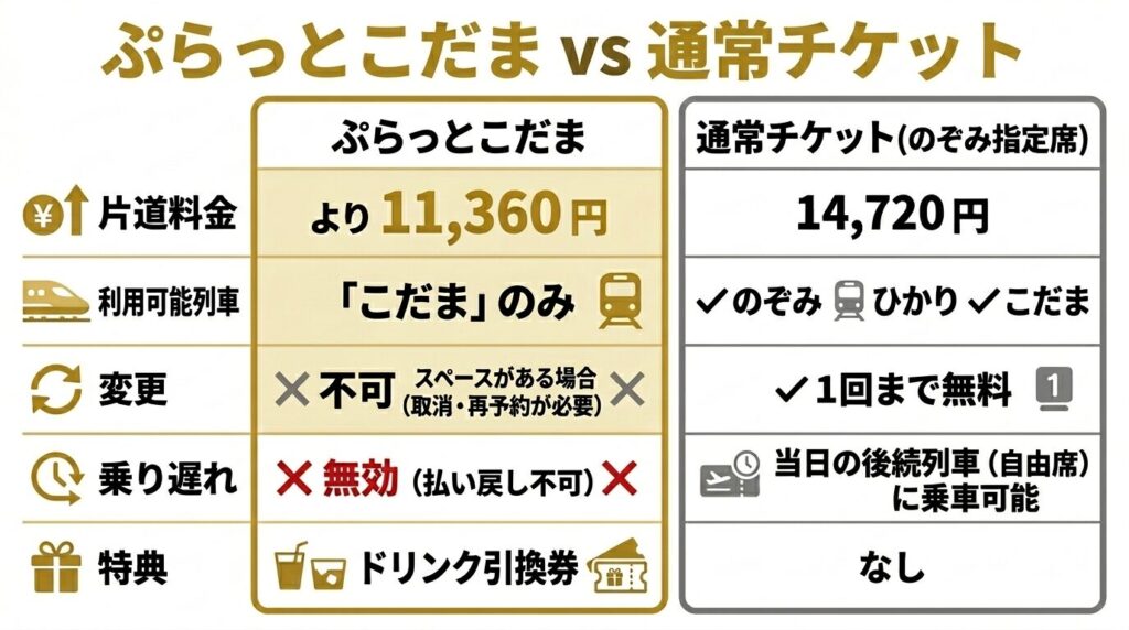 | 比較項目 | ぷらっとこだま | 通常のきっぷ(のぞみ指定席) |