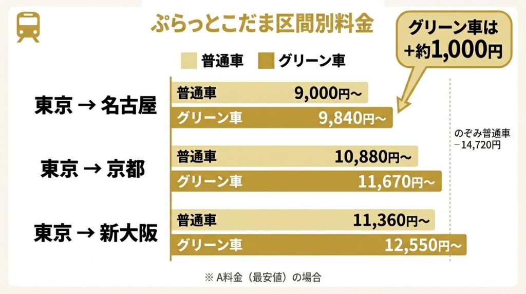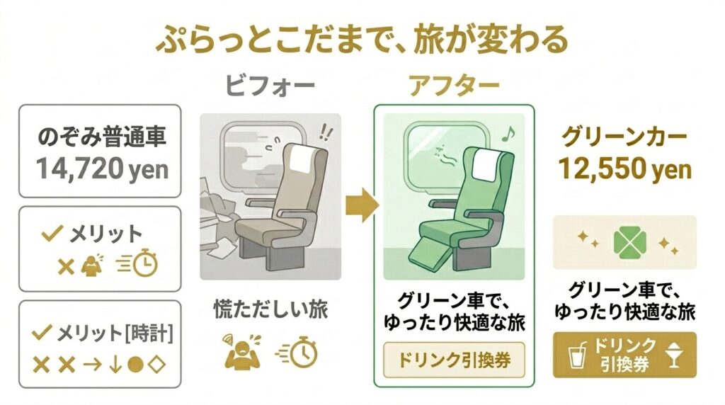 ぷらっとこだまの最大の魅力は「グリーン車がプラス約1,000円」で乗れること。通常料金との差額を考えると、グリーン車を選ばない理由がほとんどありません。