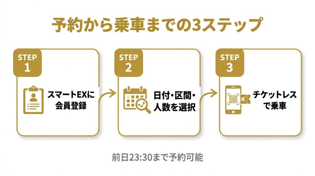 乗車日の1ヶ月前の10:00から、前日23:30まで予約可能。人気の日程は早めに埋まるため、発売開始日に予約するのが確実です