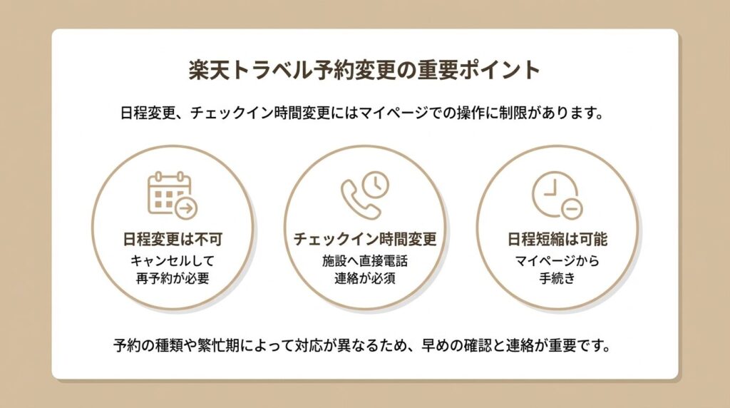 楽天トラベルでは、宿泊日を別の日にずらす変更はマイページからできません。 日程を変えたい場合は、キャンセルして希望の日程で再予約する必要があります。