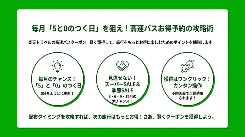 楽天トラベルの高速バスクーポンには一定の配布パターンがあるので、タイミングを把握しておくと獲得しやすくなります。
