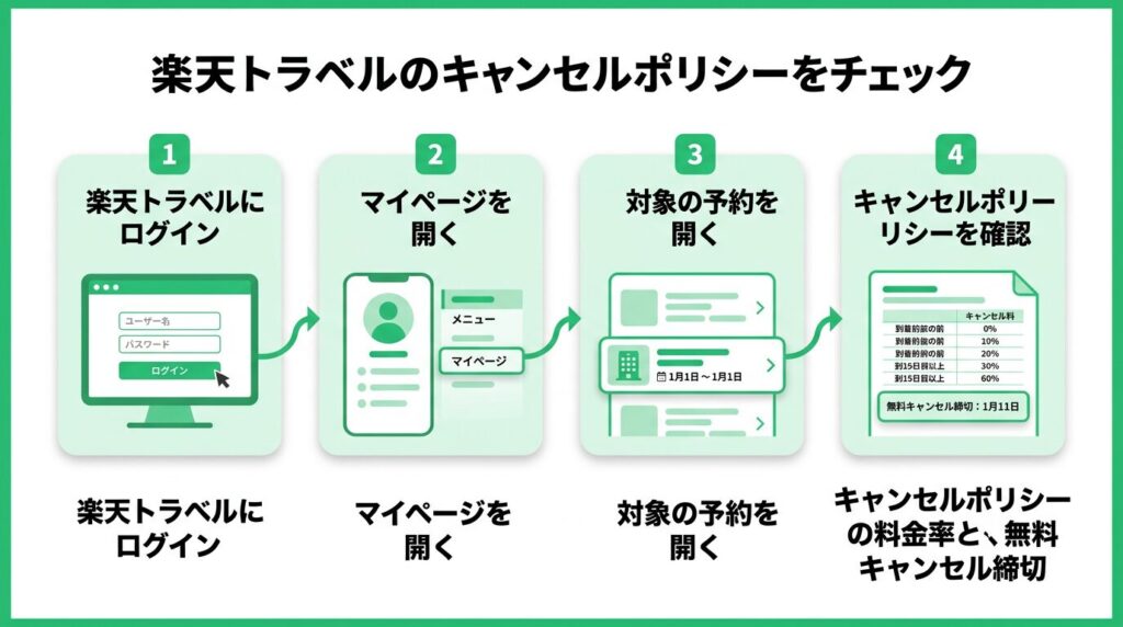 楽天トラベルにログインし、マイページの「予約確認・変更・キャンセル」から対象の予約を開いてください。予約詳細ページをスクロールすると「キャンセルポリシー」欄があり、日付ごとのキャンセル料率が一覧で表示されています。