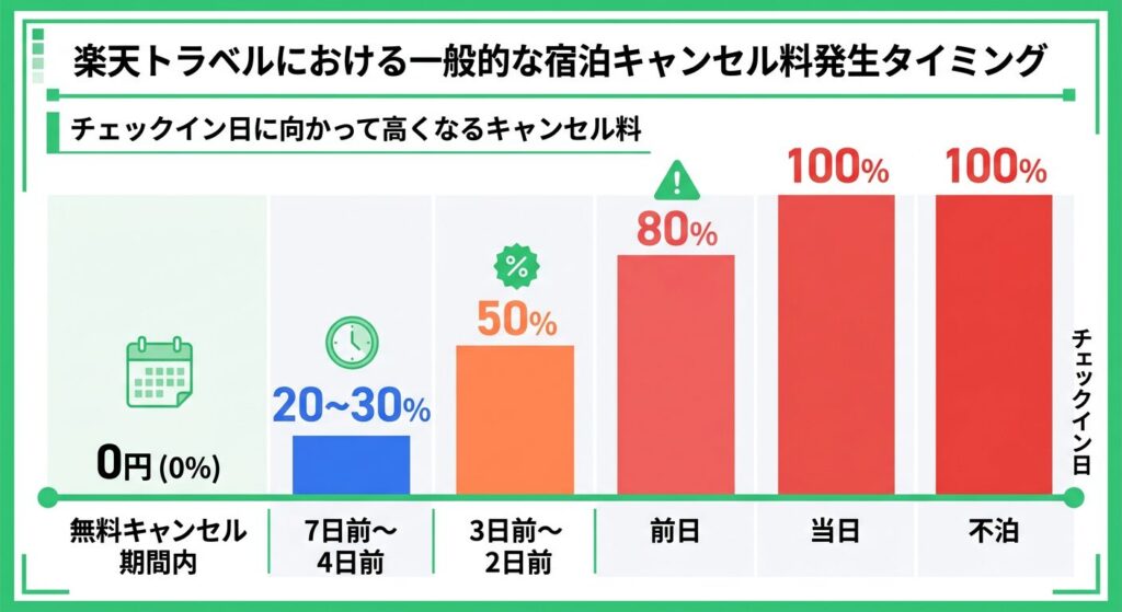 楽天トラベルのキャンセル料は施設ごとに異なります。 予約確認ページの「キャンセルポリシー」欄を開けば、自分の予約の無料期限と料率を今すぐ確認できます。