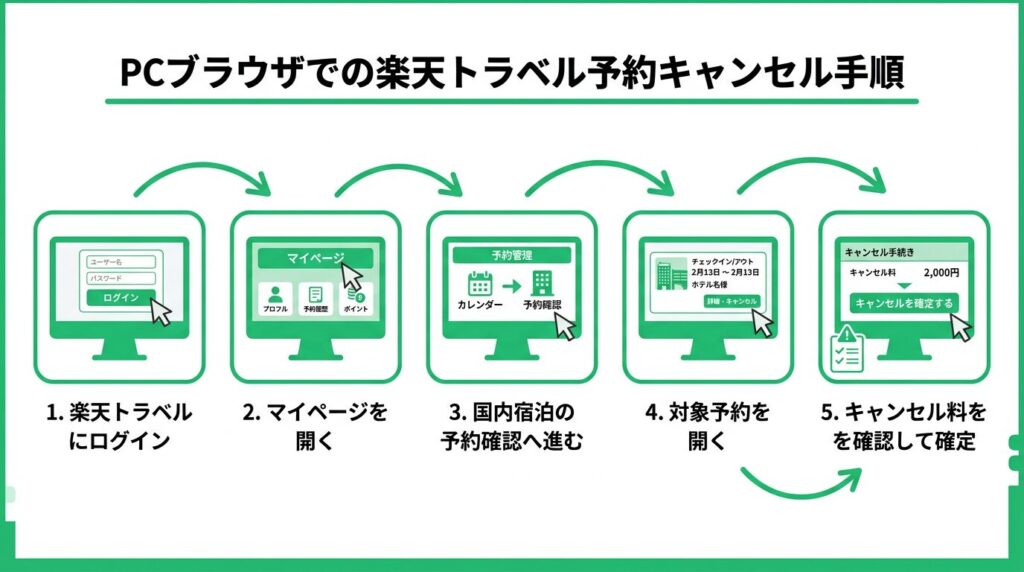 スマホのブラウザ(Safari・Chrome)でも同じ流れです。 楽天トラベルのサイトにログイン → マイページ → 予約一覧 → 対象予約 → キャンセルの順に進みます。