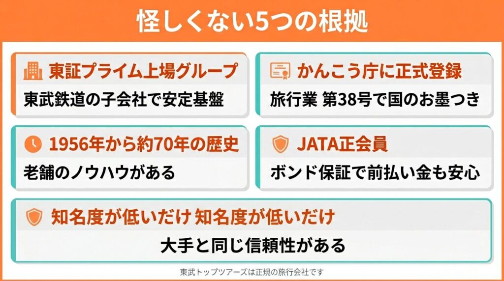 結論から言うと、東武トップツアーズは東証プライム上場の東武鉄道グループの旅行会社で、観光庁に正式登録された正規の旅行業者です。