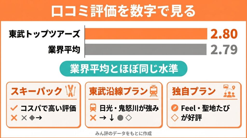 みん評のカテゴリ平均は2.79(みん評 参照時)。東武トップツアーズの2.80は業界平均とほぼ同水準です。