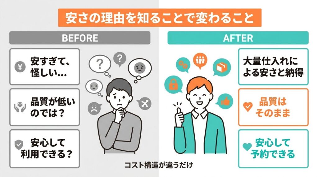 「怪しい」という印象は、知名度の低さと価格の安さからくる誤解である場合がほとんどです。この記事では、安い理由の構造・実際の口コミ・注意点を正直にまとめました。