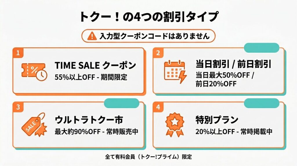 トクー!の割引は「卸価格」が基本で、その上に追加の割引手段が4種類あります。