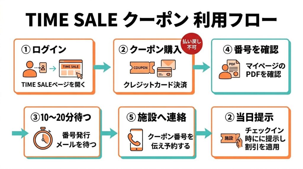 TIME SALEクーポンを利用する場合、チェックイン時に施設スタッフへクーポン(印刷したPDF、または一部クーポンはスマートフォン画面提示も可。詳細は公式FAQで確認を)を提示することで割引が適用されます。