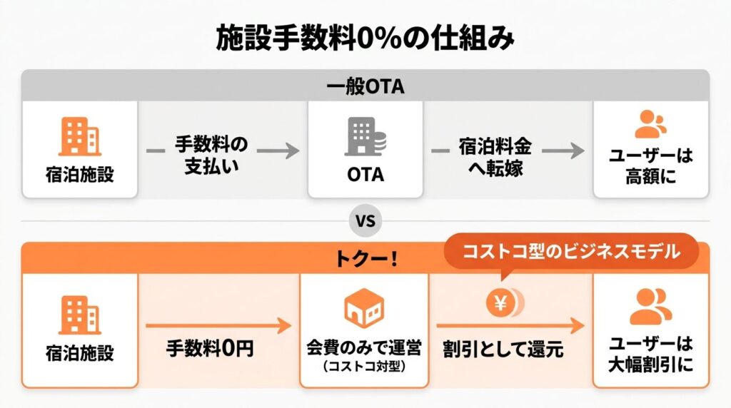 なぜトクー!でここまで大幅な割引が実現できるのか、その理由が「施設手数料0%」のビジネスモデルにあります。
