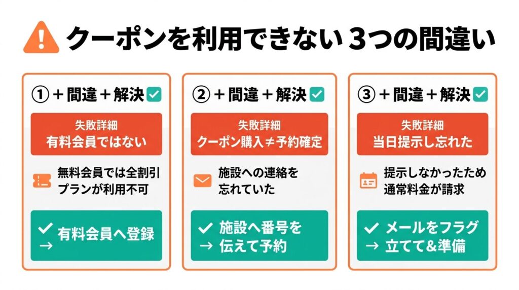 ただ、購入してから実際に施設に泊まるまでの手順を知らないと、「クーポンを買ったのに予約できていなかった」というトラブルになりやすい仕組みです。