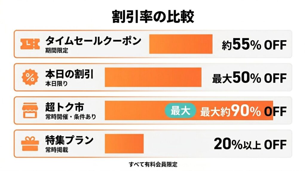 | TIME SALEクーポン | 宿泊 | 不要 (クーポン購入制) | 40%以上 | クーポンを購入→施設予約→当日提示の3ステップ |