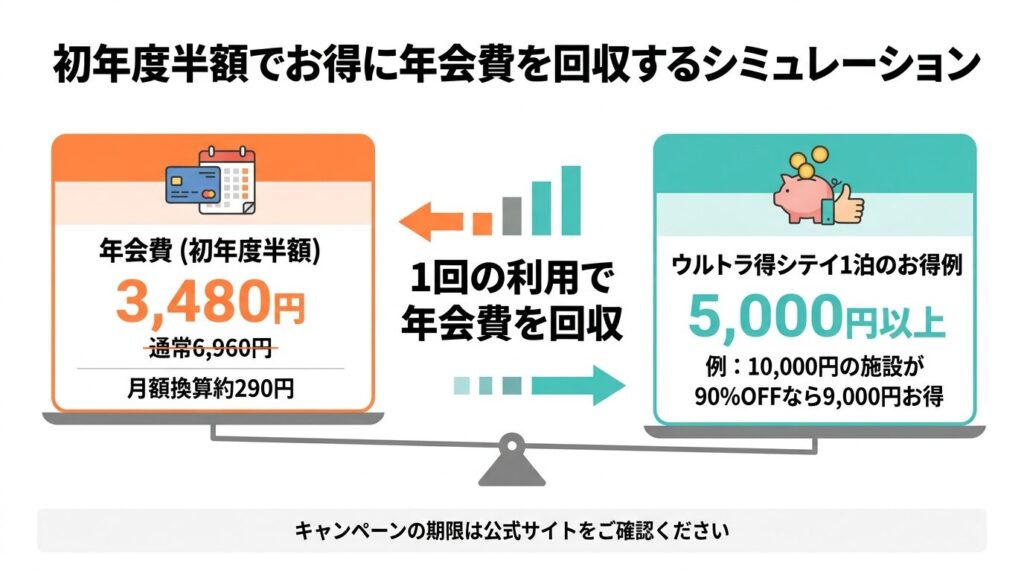 年会費は6,960円(月額580円相当)ですが、初年度半額キャンペーンが適用中の場合は3,480円からスタートできます。