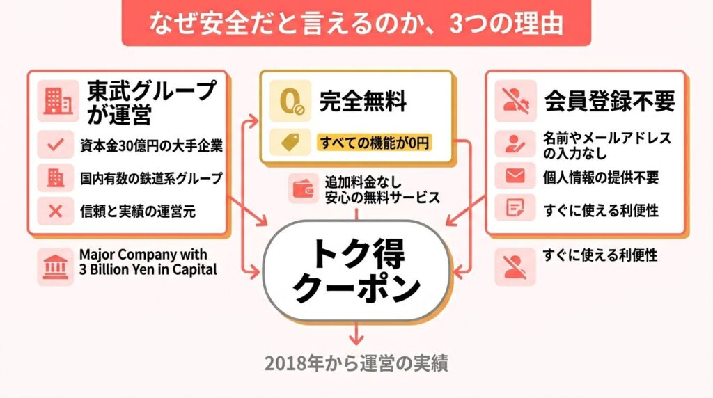 結論から言うと、トクトククーポンは東武グループが運営する正規サービスで、会員登録不要・完全無料で使えます。2018年から続いている、全国1,100件超の施設で使えるクーポンサービスです。